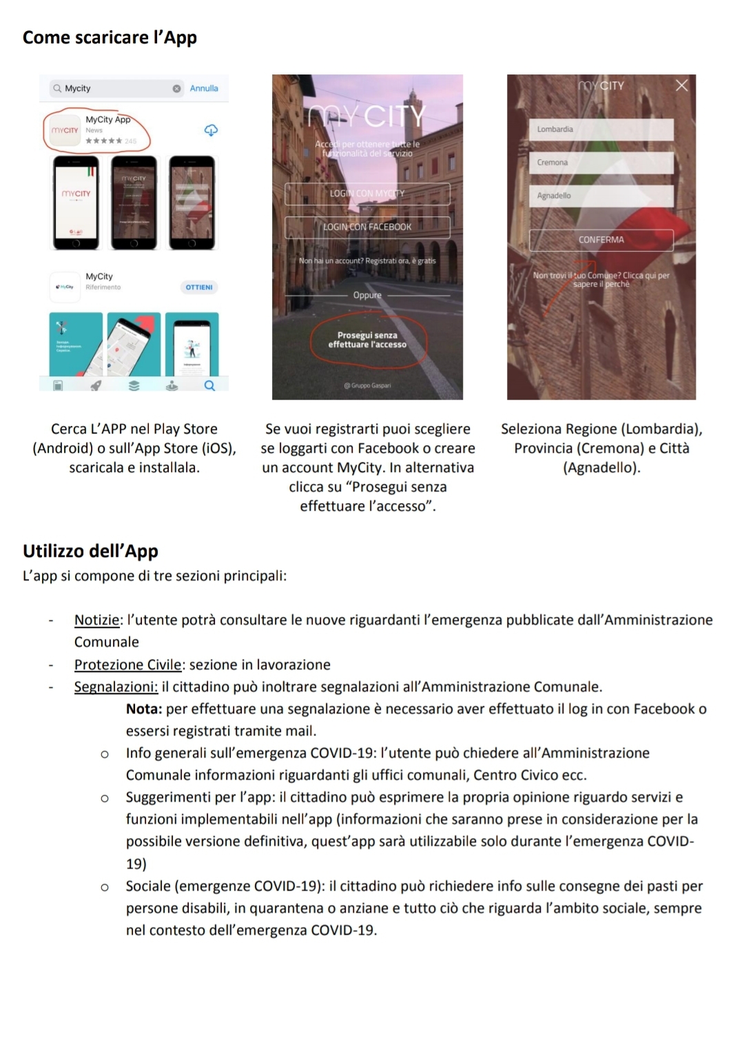 L’App è scaricabile gratuitamente sia da Apple Store sia da Play Store cercando “MyCity”. Una volta che la App è avviata, scegliete la Regione, la Provincia e poi il Comune.