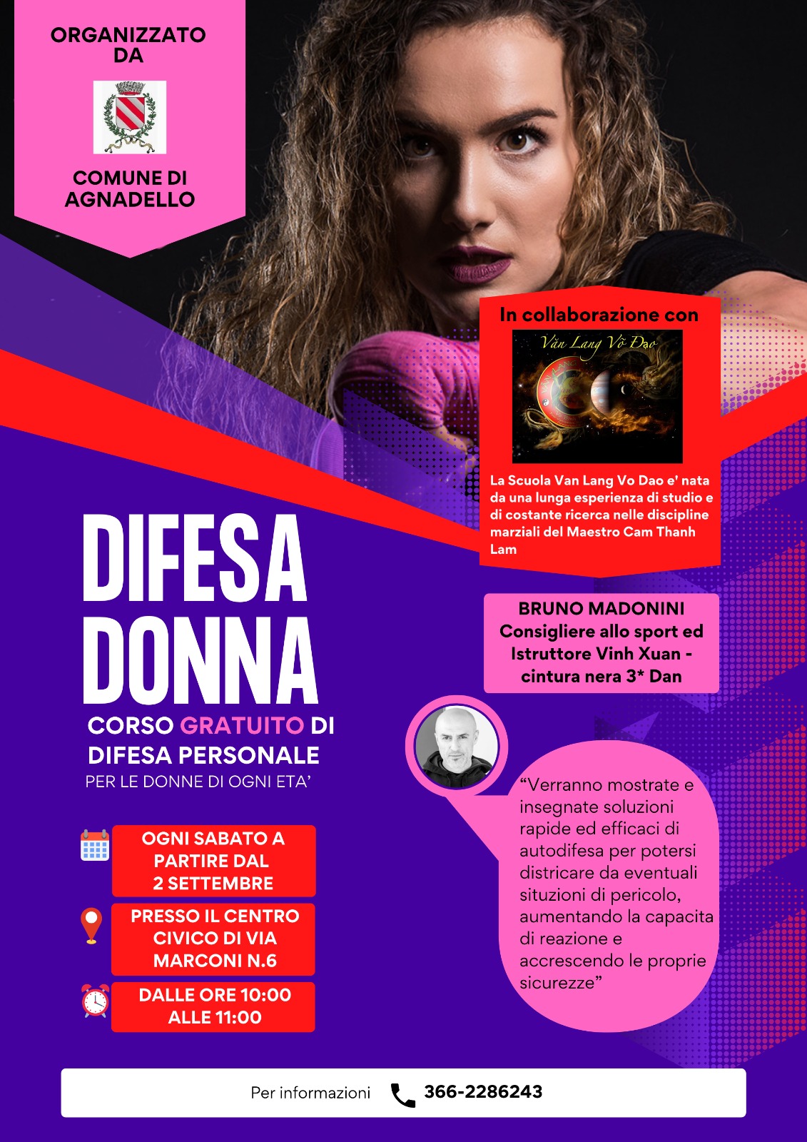 L’obiettivo è quello di imparare a riconoscere i segnali di pericolo e le situazioni a rischio in cui possono essere vittime, a casa, al lavoro o per strada, per evitarle o riuscire a fronteggiarle con alcune tecniche difensive di base. Il corso, della durata di un'ora a lezione, dalle 10 alle 11 ogni sabato a partire dal 2 settembre si tiene presso il Centro Civico comunale (Via Marconi civ. 6). La partecipazione è gratuita.