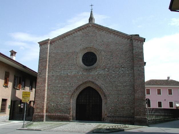 La facciata, a capanna,scandita da contrafforti e decorata alla sommità da una cornice in cotto ornata da archetti ciechi, ospita solo gli elementi strettamente funzionali: il rosone e il portale basso e ampio.